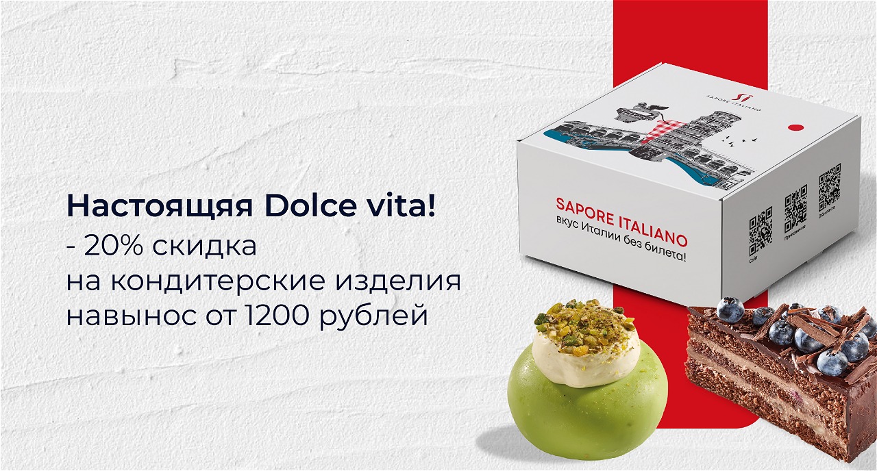 При заказе любых кондитерских изделий навынос на сумму от 1200 рублей, Вы получаете скидку 20% на все сладости в заказе!🥰